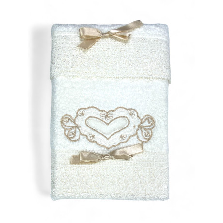 Das Handtuchset "Vanità Panna" ist ein Meisterwerk von Eleganz und Zartheit aus reinem Baumwollfrottee mit raffinierten Verzierungen. Die herzförmige Stickerei und die beige Satinschleife sowie die floralen Spitzendetails machen dieses Set perfekt für ein besonderes Geschenk.