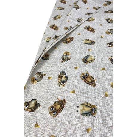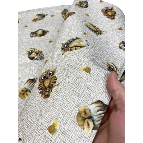 Tejido impreso digitalmente , este patrón representa pequeños búhos sobre un fondo beige.