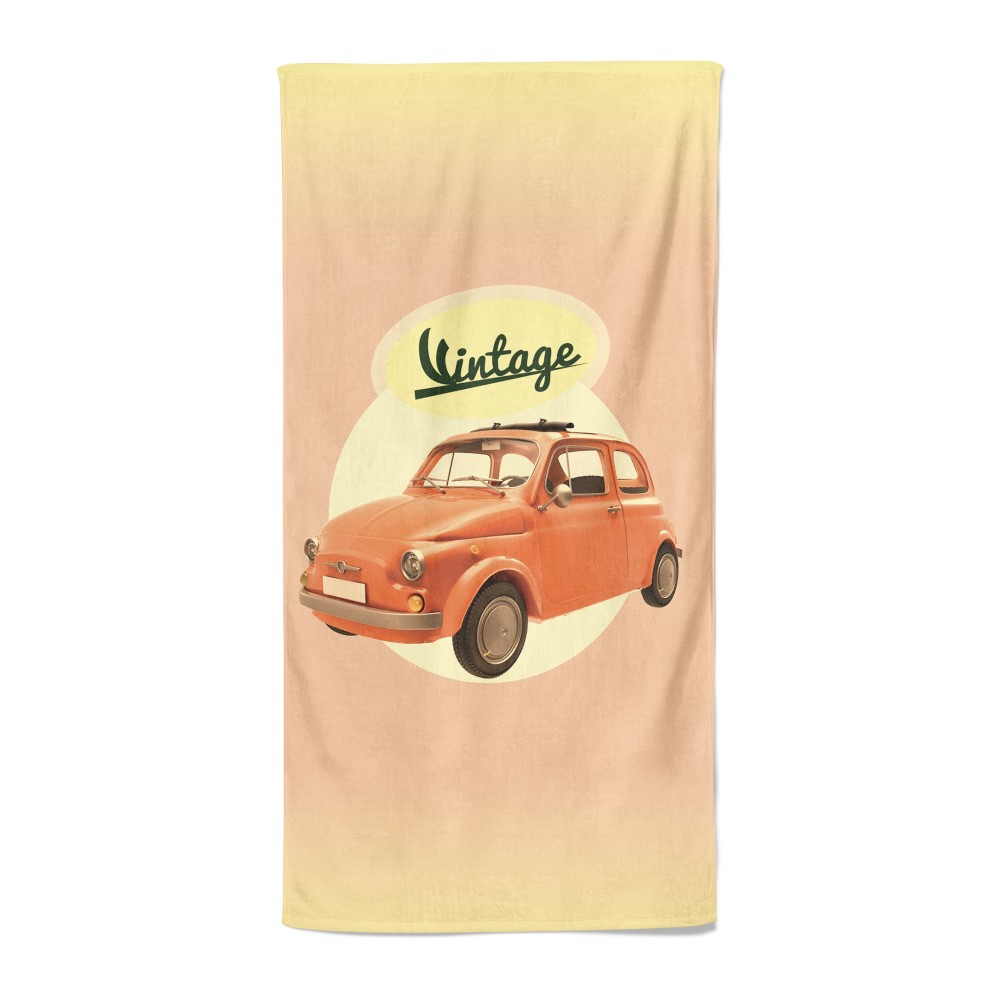 Esta toalla ideal para el mar o para la piscina está hecha de tela de rizo y representa una 500, una máquina que ha unido a generaciones enteras. El fondo está sombreado en tonos naranjas, amarillos y salmón, en el centro se representa el mito de los años 30 y la escritura "Vintage".