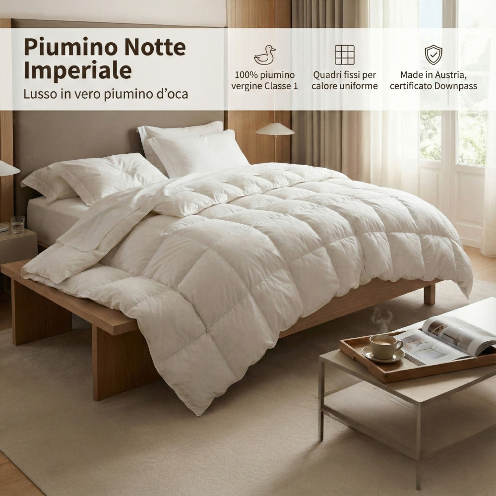 La couette Notte Imperiale, 100 % fabriquée en Autriche, est le choix idéal pour ceux qui recherchent une vraie couette à la poule de gamme supérieure, avec un confort luxueux, une structure à taudis fixe et une traçabilité certifiée et vérifiable.