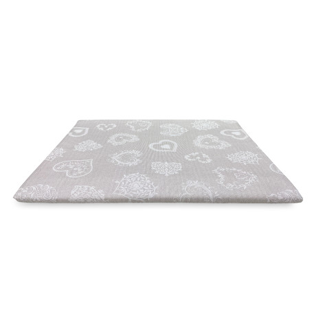 È in stile tirolese, il fondo è nel colore grigio - tortora ed è stampato con cuori bianchi.