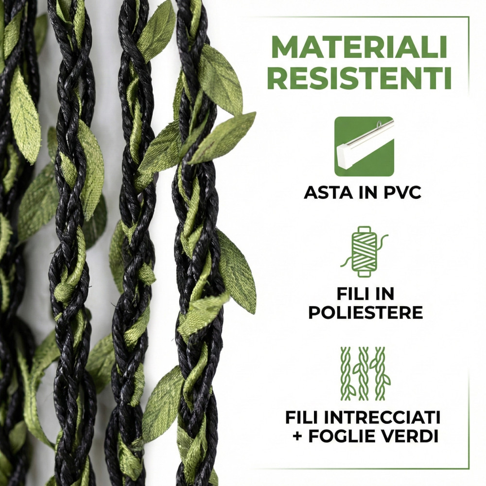 La tenda a fili con foglie verdi è perfetta per chi desidera un elemento decorativo pratico e leggero per porte, finestre e portefinestre. I fili intrecciati neri con piccole foglie verdi creano un gradevole effetto naturale che valorizza ingresso, balcone o veranda.